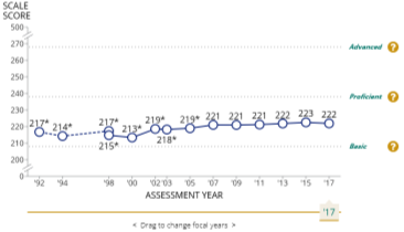 The state profiles tool shows detailed results going back to 1992. In that year, the national public score for fourth graders was 215, and 60% of those students met or exceeded the basic standard for reading skill. To be specific, in 27 years of assessing our effectiveness, our national public average score has only increased by four points!